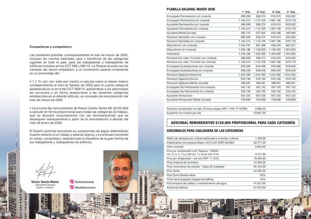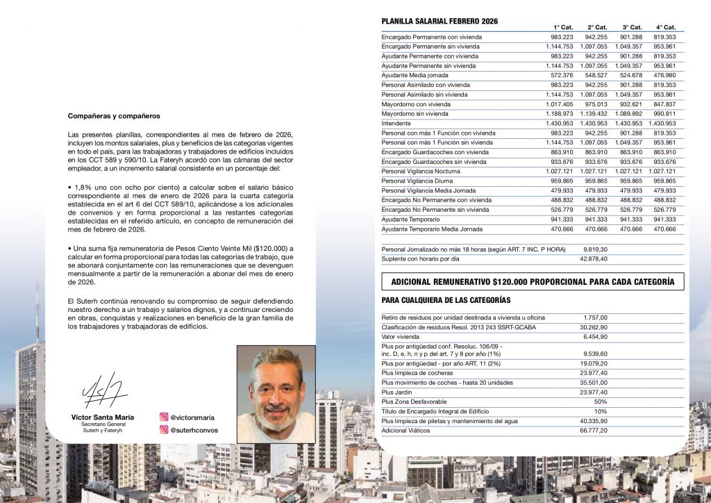 Compañeras y compañeros Para el mes de Noviembre de 2025, la Fateryh acordó con las cámaras del sector empleador un incremento salarial del 1,6 %. Las presentes planillas incluyen los montos salariales, plus y beneficios de las categorías vigentes en todo el país, para las trabajadoras y trabajadores de edificios incluidos en los CCT 589... Ver más