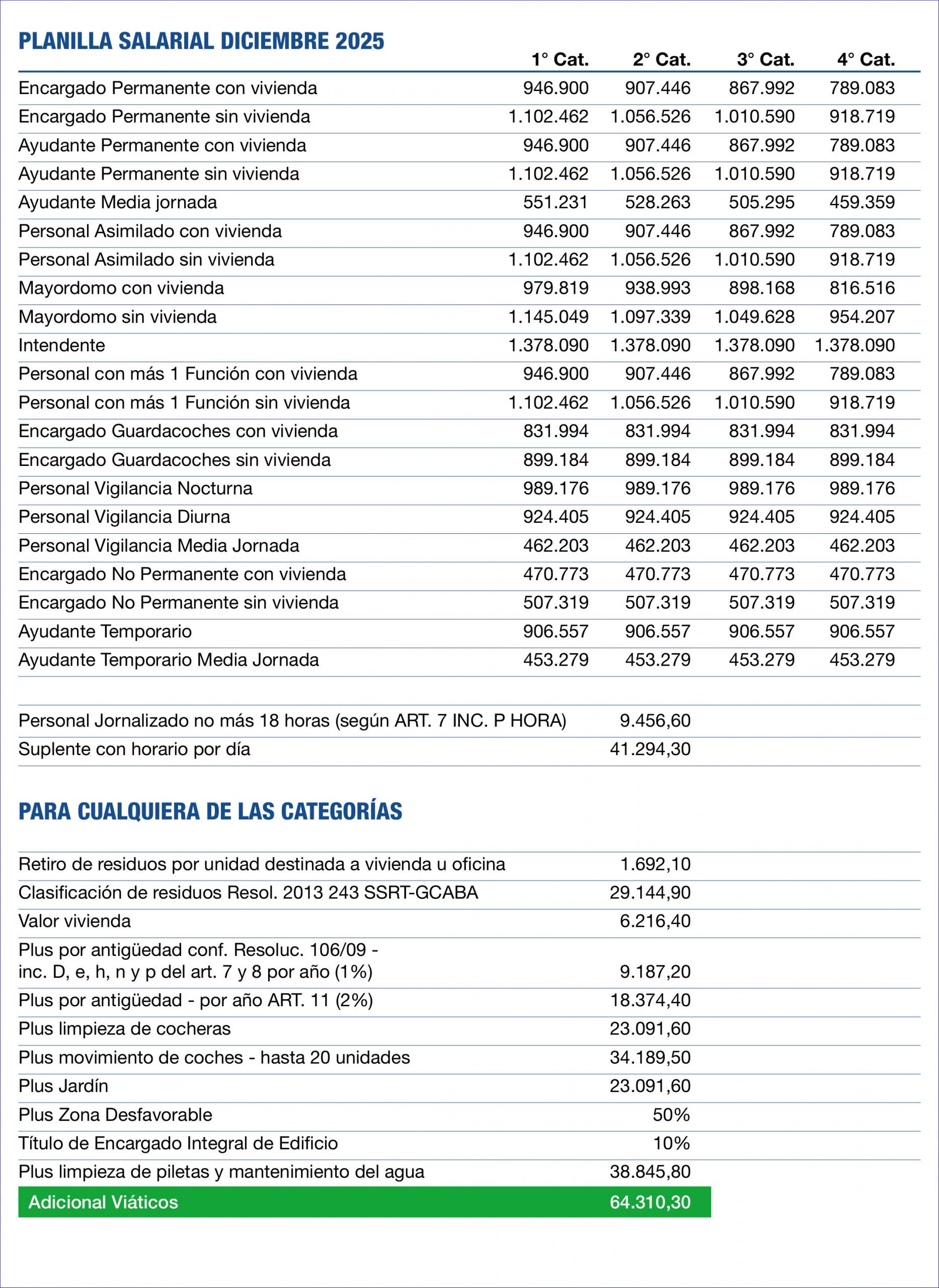 Las presentes planillas, correspondientes al mes de diciembre de 2025, incluyen los montos salariales, plus y beneficios de las categorías vigentes en todo el país, para las trabajadoras y trabajadores de edificios incluidos en los CCT 589 y 590/10.