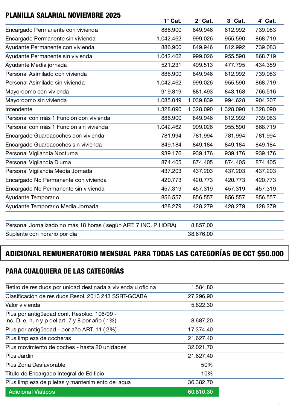 Para el mes de Noviembre de 2025, la Fateryh acordó con las cámaras del sector empleador un incremento salarial del 1,6 %. Las presentes planillas incluyen los montos salariales, plus y beneficios de las categorías vigentes en todo el país, para las trabajadoras y trabajadores de edificios incluidos en los CCT 589 y 590/10.