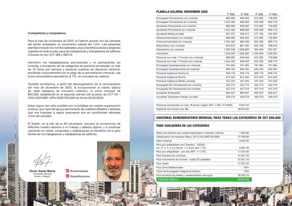 – Un incremento salarial de 1,6% (uno con seis por ciento) a calcular sobre el salario básico correspondiente al mes de octubre de 2025 para la cuarta categoría establecida en el art 6 del CCT589/10, aplicándose a los adicionales de convenios y en forma proporcional a las restantes categorías establecidas en el referido artículo, en concepto de remuneración del mes de noviembre de 2025.